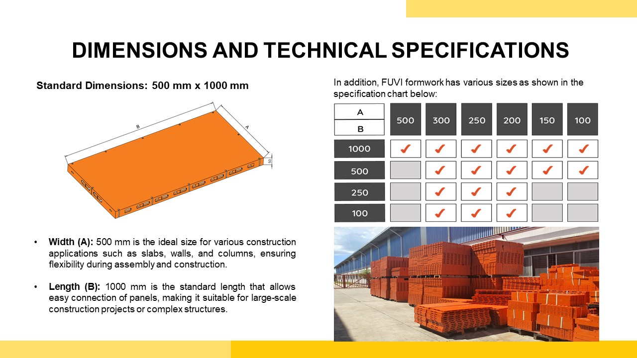 FUVI formwork features a standard size of 500x1000x50 mm, ideal for slabs, walls and columns. With versatile dimensions and easy assembly, it ensures flexibility and precision for both residential and industrial construction projects.